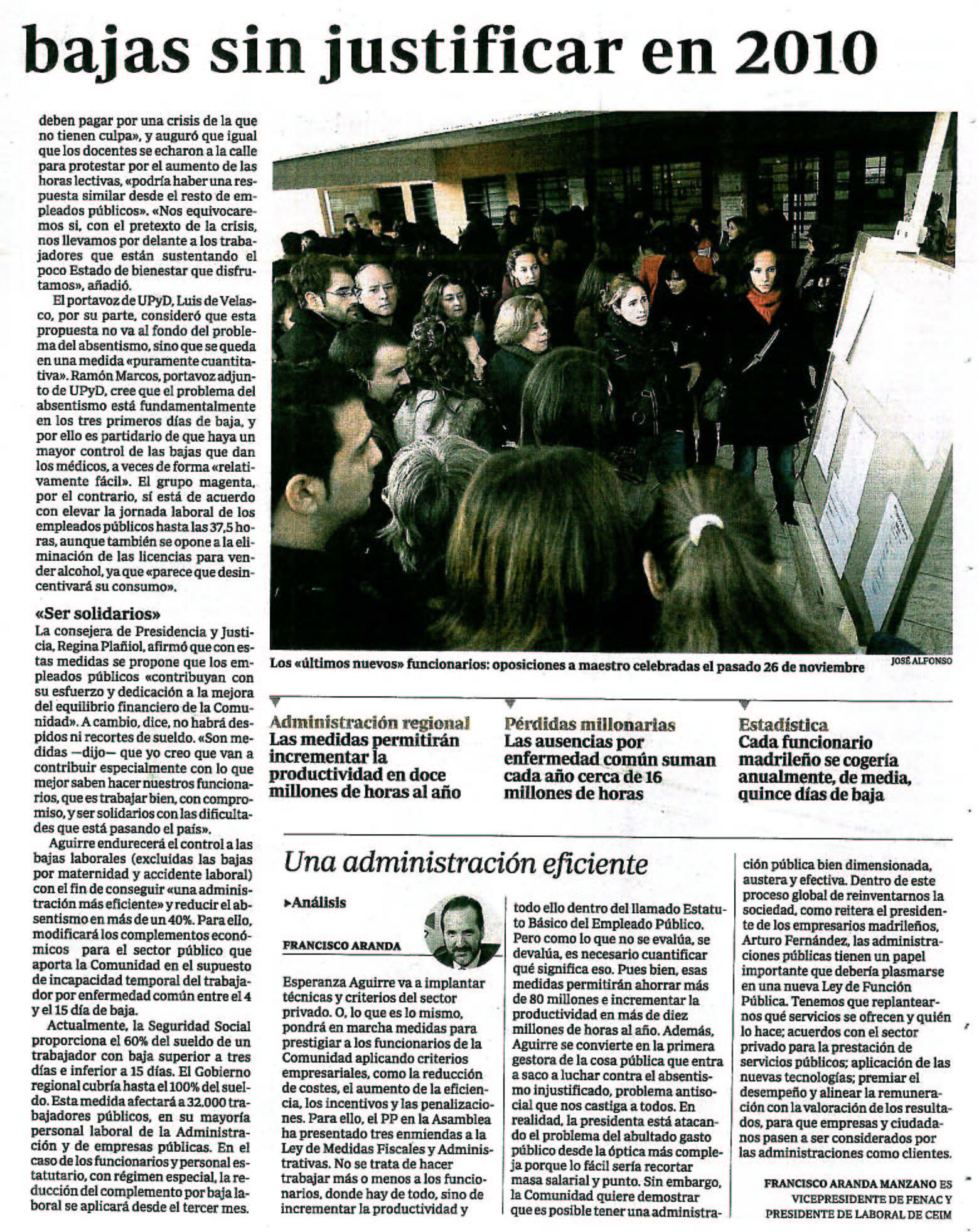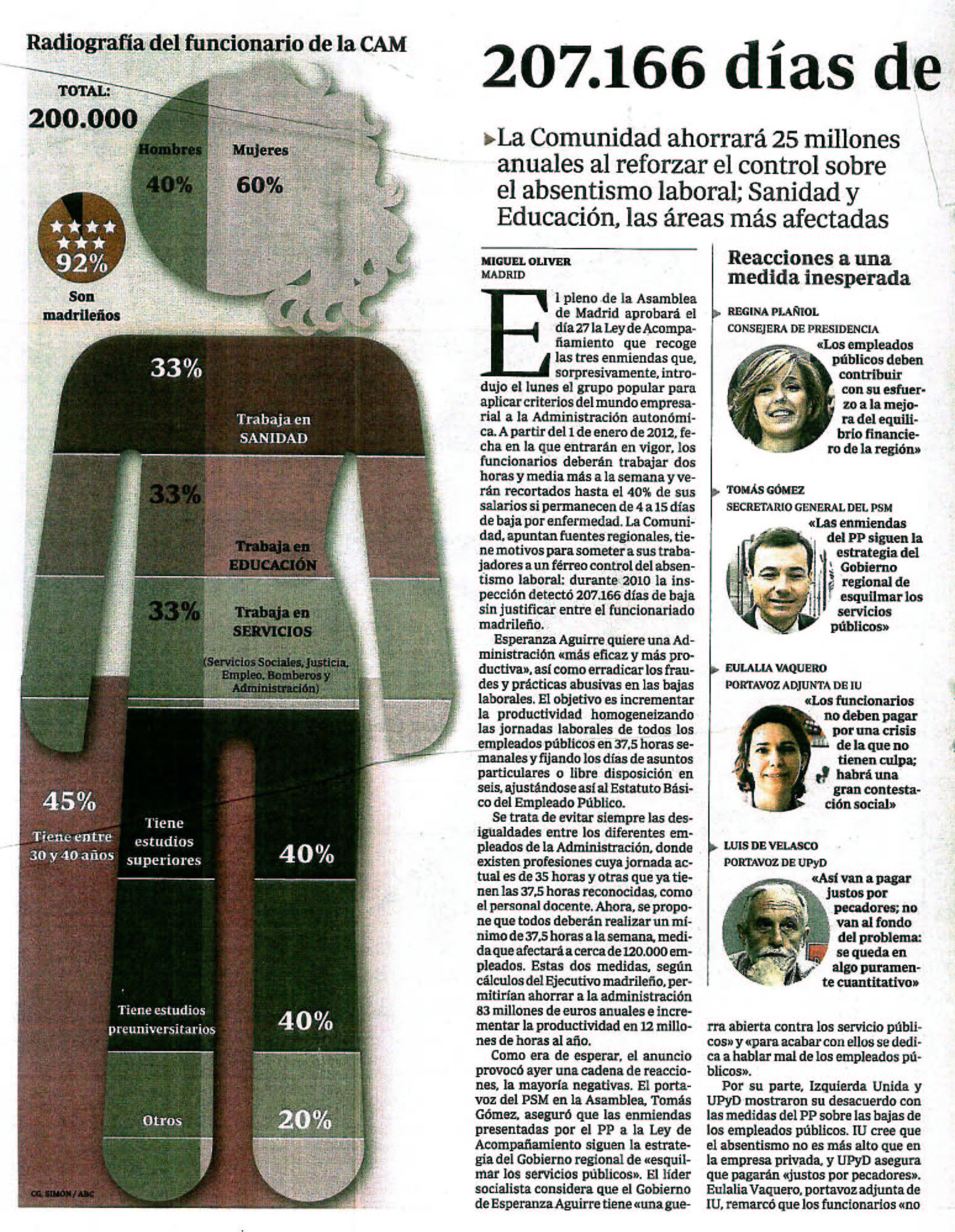 La Comunidad ahorrara 25 millones anuales al reforzar el control sobre el absentismo laboral; Sanidad y Educacion, las areas mas afectadas.
