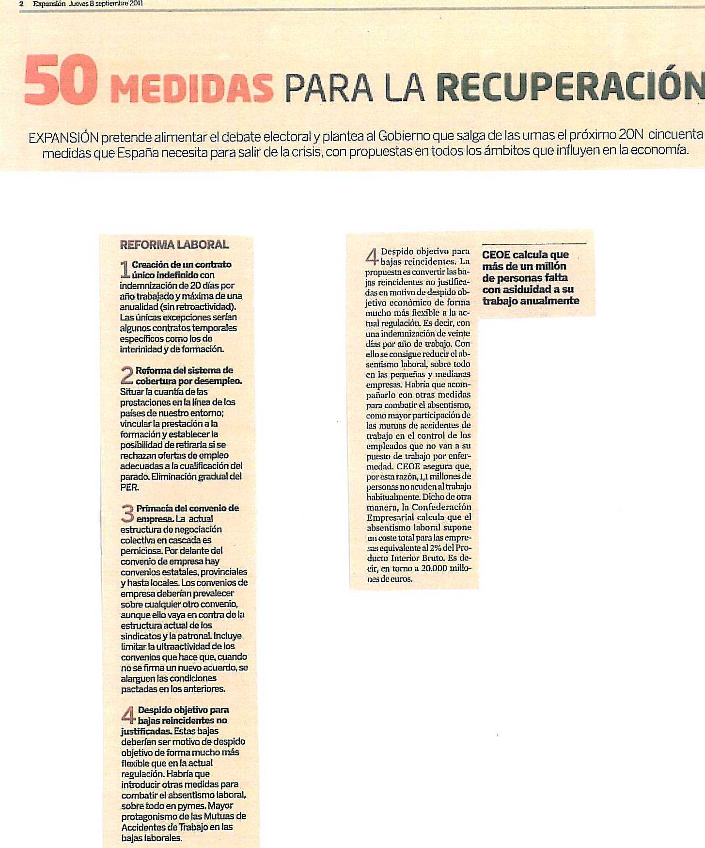 Expansion pretende alimentar el debate electoral y plantea al Gobierno que salga de las urnas el proximo 20N cincuenta medidas que Espana necesita para salir de la crisis, con propuestas en todos los ambitos que influyen en la economia.