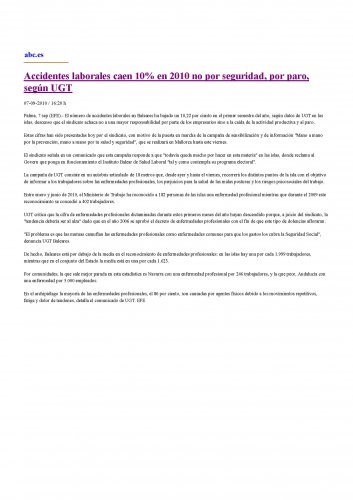 El número de accidentes laborales en Baleares ha bajado un 10,22 por ciento en el primer semestre del año, según datos de UGT en las islas, descenso que el sindicato achaca no a una mayor responsabilidad por parte de los empresarios sino a la caída de la actividad productiva y al paro.