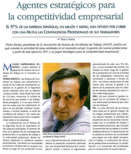 Pedro Barato, presidente de la Asociacion de Mutuas de Accidentes de Trabajo (AMAT), analiza en que consiste la actividad de estas entidades en el momento actual, la gestion de nuevas prestaciones a partir de este ejercicio 2011 y su papel estrategico para la competitividad empresarial.