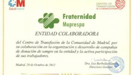 Fuente: Fraternidad Muprespa ha recibido del certificado como Entidad Colaborada del Centro de Transfusiones de la Comunidad de Madrid. Los empleados de los centros de trabajo de la mutua ubicados en el barrio de las letras han participado voluntariamente en una jornada de donacion de sangre. La colaboracion ha sido posible gracias al Servicio de