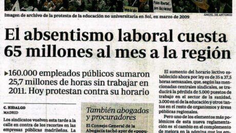 Fuente: ABC 160.000 empleados publicos sumaron 25,7 millones de horas sin trabajar en 2011. Hoy protestan contra su horario. 1023_artRel.pdf