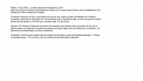 Fuente: finanzas.com La Unión General de Trabajadores (UGT) alertó hoy de que el aumento de accidentes de trabajo que no causan baja se debe a que los trabajadores no la solicitan por miedo a quedarse sin empleo. El sindicato reaccionó así en un comunicado tras conocer que, según los datos del Ministerio de Trabajo e