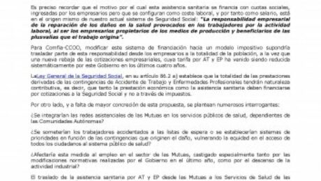 Fuente: comfia.info Para la Federacion de Servicios Financieros y Administrativos de CCOO (COMFIA), la propuesta del gobierto para el cambio de modelo de financiacion de la asistencia sanitaria por Accidente de Trabajo y Enfermedad Profesional reduciria injustificadamente la responsabilidad empresarial derivada de esta contingencia y les supondria ademas una nueva bajada de las cotizaciones a