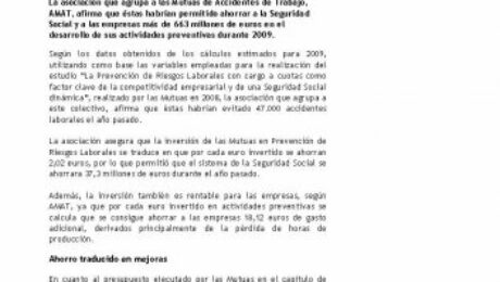 Fuente: bormart.es La asociacion que agrupa a las Mutuas de Accidentes de Trabajo, AMAT, afirma que estas habrian permitido ahorrar a la Seguridad Social y a las empresas mas de 663 millones de euros en el desarrollo de sus actividades preventivas durante 2009. Segun los datos obtenidos de los calculos estimados para 2009, utilizando como