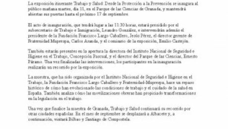 Fuente: radiogranada.es La exposición itinerante Trabajo y Salud: Desde la Protección a la Prevención se inaugura al público mañana martes, día 11, en el Parque de las Ciencias de Granada, y mantendrá abiertas sus puertas hasta el próximo 17 de septiembre. El acto de inauguración, que tendrá lugar a las 11:30 horas, estará presidido por
