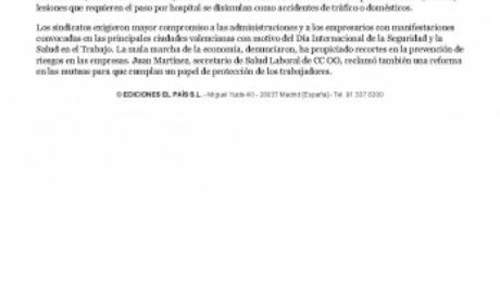 Fuente: EL PAIS.COM Los accidentes laborales experimentaron el ano pasado un descenso espectacular: hubo 51.005 siniestros (25.837 menos que en 2008), lo que representa una caida del 32,9%, superior a la media espanola, que retrocedio un 27,1%. Las muertes en el tajo se redujeron un 21,9% (hubo, aun asi, 57), aunque en este caso con