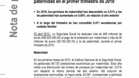 La Seguridad Social ha tramitado 84.720 procesos de maternidad y 70.009 de paternidad en el primer trimestre de 2010