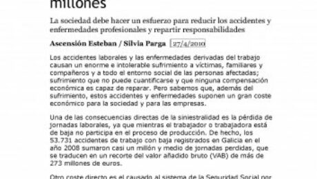 Fuente: lavozdegalicia.es La sociedad debe hacer un esfuerzo para reducir los accidentes y enfermedades profesionales y repartir responsabilidades Los accidentes laborales y las enfermedades derivadas del trabajo causan un enorme e intolerable sufrimiento a víctimas, familiares y compañeros y a todo el entorno social de las personas afectadas; sufrimiento que no puede cuantificarse y que