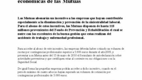Fuente: ejecutivos.es Las Mutuas abonaran un incentivo a las empresas que hayan contribuido especialmente a la disminucion y prevencion de la siniestralidad laboral. Para el abono de estos incentivos, las Mutuas disponen de hasta 118 millones provenientes del Fondo de Prevencion y Rehabilitacion el cual se nutre con los excedentes de la buena gestion que