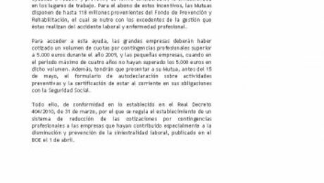 Las empresas que hayan contribuido a la disminucion y prevencion de la siniestralidad podran acceder a ayudas economicas de las Mutuas