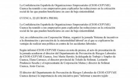 Fuente: lainformacion.com La Confederacion Espanola de Organizaciones Empresariales (CEOE-CEPYME) Cuenca ha reunido a sus empresarios para explicarles las reducciones en la cotizacion social de las que pueden beneficiarse en caso de baja siniestralidad. La Confederacion Espanola de Organizaciones Empresariales (CEOE-CEPYME) Cuenca ha reunido a sus empresarios para explicarles las reducciones en la cotizacion social de