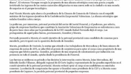 Fuente: elpais.com La patronal bendice la candidatura de Morata, otrora rival de Gonzalez Jose Vicente Gonzalez, presidente de la patronal de Valencia, solia decirle a Arturo Virosque, presidente saliente de la Camara de Comercio: ‘Tu y yo tenemos que hacer una joint venture: yo pongo las ideas y tu, el dinero’. El veterano Virosque recogia