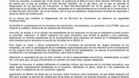 Fuente: comfia El Reglamento de Prevencion introduce modificaciones escasas que no solucionan la perdida de calidad de los sistemas de Prevencion. Como ya conoceis, el pasado dia 23 de marzo, se publico en el BOE el nuevo Real Decreto 337/2010, de 19 de marzo por el que se modifica el Real Decreto 39/1997, de 17