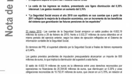 Fuente: MTIN – El superavit supone el 0,44% del Producto Interior Bruto – La caida de los ingresos se modera, presentando una ligera disminucion del 0,35% interanual. Los gastos muestran un aumento del 5,76% – La Seguridad Social encara el ano 2010 con equilibrio en sus cuentas que a partir de 2011 reflejaran la mejoria