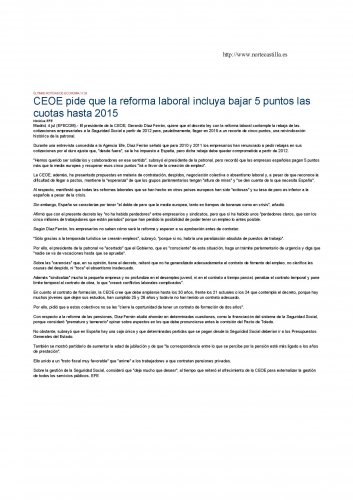 El presidente de la CEOE, Gerardo Díaz Ferrán, quiere que el decreto ley con la reforma laboral contemple la rebaja de las cotizaciones empresariales a la Seguridad Social a partir de 2012 para, paulatinamente, llegar en 2015 a un recorte de cinco puntos, una reivindicación histórica de la patronal.