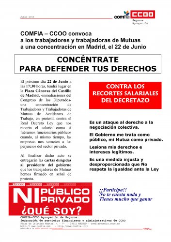 Comfia-CC.OO. convoca a los trabajadores y trabajadoras de Mutuas a una concentracion en Madrid, el 22 de junio.