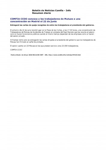 El próximo día 22 de junio tendrá lugar en la Plaza de las Cortes, a las 17:30 horas, una concentración de Trabajadores de Mutuas de Accidentes de Trabajo en protesta del Real Decreto que les recorta el salario como si fueran funcionarios públicos cuando al mismo tiempo dependen de las empresas como si fueran del sector privado.