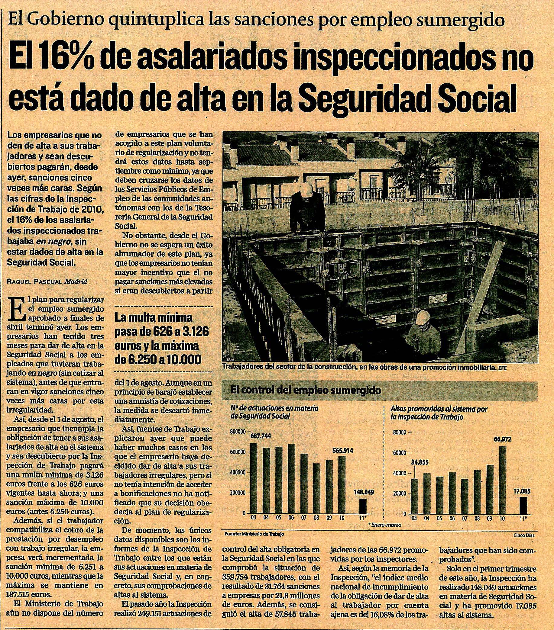 El 16% de asalariados inspeccionados no esta dado de alta en la Seguridad Social.