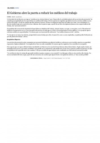 Un borrador de real decreto en el que se "establecen los criterios básicos" para "desarrollar la actividad sanitaria de los servicios de prevención" ha causado gran inquietud entre los especialistas en medicina del trabajo. El texto suaviza los requisitos que deben tener los servicios médicos en los centros de trabajo, o los de las mutuas que dan asistencia externa. Si ahora es obligatorio que haya un médico por cada 1.000 trabajadores, el decreto establece que será a partir de 2.000. Además, abre la puerta a que, a partir de esa cifra, las siguientes plazas no las ocupen médicos del trabajo, sino "personal sanitario".