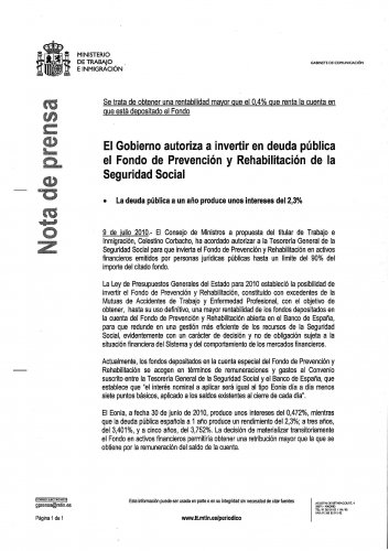 La Ley de Presupuestos Generales del Estado para 2010 estableció la posibilidad de invertir el Fondo de Prevención y Rehabilitación, constituido con excedentes de la Mutuas de Accidentes de Trabajo y Enfermedad Profesional, con el objetivo de obtener, hasta su uso definitivo, una mayor rentabilidad de los fondos depositados en la cuenta del Fondo de Prevención y Rehabilitación abierta en el Banco de España, para que redunde en una gestión más eficiente de los recursos de la Seguridad Social, evidentemente con un carácter de decisión y no de obligación sujeta a la situación financiera del Sistema y del comportamiento de los mercados financieros.