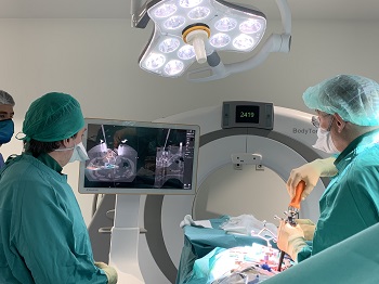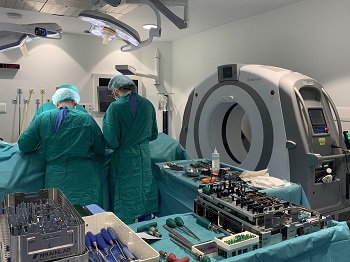 El TAC (BodyTom) completa y mejora este software de navegación, ya que ofrece a los cirujanos una visión exacta de la anatomía del paciente y del instrumental quirúrgico en tiempo real y les permite una ejecución de extrema precisión, a nivel milimétrico, durante la intervención. Está equipado con una pantalla táctil de 32 pulgadas, en la que se visualizan imágenes con resolución 4K, con un alto nivel de detalle. Ello permite planificar, revisar, documentar y transmitir la intervención, vía streaming, desde cualquier parte del quirófano del Hospital.
