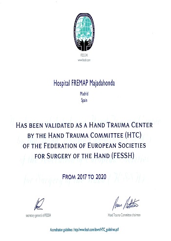 La Unidad de Cirugía de la Mano del Servicio de Cirugía Ortopédica y Traumatología del Hospital FREMAP de Majadahonda, está acreditado por el Hand Trauma Comitee de la Federación Europea de Cirugía de la Mano (FESSH) desde 2015, y este año ha sido reacreditada en el Congreso anual de la Sociedad con el Diploma of the European Board of Hand Surgery (EBHS).