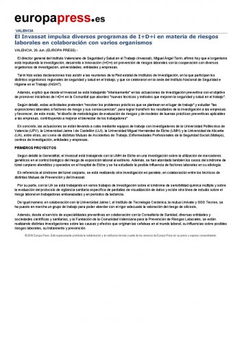 El director general del Instituto Valenciano de Seguridad y Salud en el Trabajo (Invassat), Miguel Ángel Tarín, afirmó hoy que el organismo está impulsando la investigación, desarrollo e innovación (I+D+i) en prevención de riesgos laborales con la cooperación con diversos organismos de investigación, universidades, entidades y empresas.