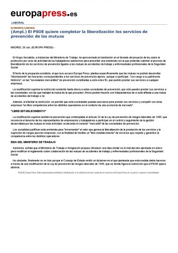 El Grupo Socialista, a instancias del Ministerio de Trabajo, ha aprovechado la tramitación en el Senado del proyecto de ley sobre la protección por cese de actividad de los trabajadores autónomos para presentar una enmienda con la que pretende culminar el proceso de liberalización de los servicios de prevención ligados a las mutuas de accidentes de trabajo y enfermedades profesionales de la Seguridad Social.
