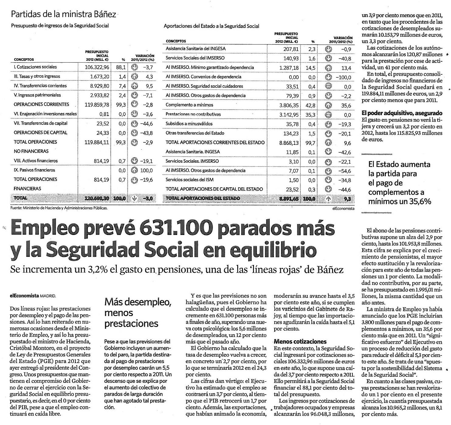 Empleo preve 631.100 parados mas y la Seguridad Social en equilibrio.