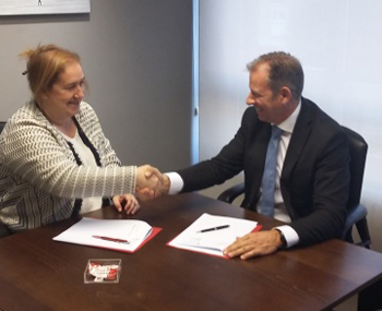 La presidenta del COFNA Marta Galipienzo Jiménez y el director regional de FREMAP, Javier Peralta López, han sido los encargados de suscribir el documento por el que los trabajadores de las empresas mutualistas o trabajadores autónomos adheridos, que hayan sufrido un accidente de trabajo o estén afectados de enfermedad profesional, podrán elegir libremente la farmacia de Navarra que deseen para que les sean dispensados los medicamentos que le han sido recetados por FREMAP.