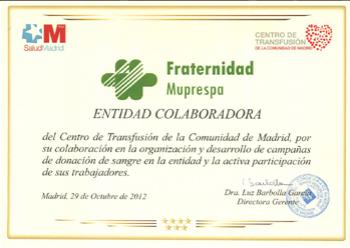 Fraternidad Muprespa ha recibido del certificado como Entidad Colaborada del Centro de Transfusiones de la Comunidad de Madrid. Los empleados de los centros de trabajo de la mutua ubicados en el barrio de las letras han participado voluntariamente en una jornada de donacion de sangre.