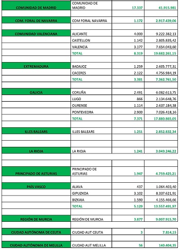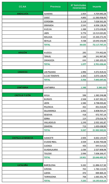 Los importes mayores fueron abonados, en este orden, en las Comunidades Autónomas de Andalucía, Comunidad de Madrid, Castilla-La Mancha, Castilla y León y Comunidad Valenciana