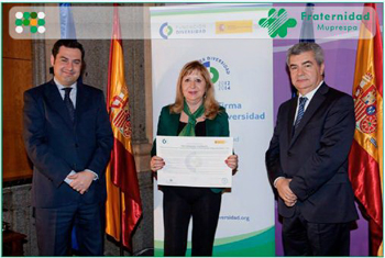D Concepcion Ortiz, directora de RSC de Fraternidad Muprespa, fue la encargada de representar a la entidad en el acto que organizo la Fundacion Diversidad, recibiendo de manos del Secretario de Estado de Servicios Sociales e Igualdad, D. Juan Manuel Moreno, y del presidente de la Fundacion Diversidad, D. Javier Benavente, el certificado de empresa firmante.