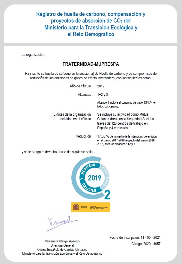 Fraternidad-Muprespa cuenta asimismo con el aval de importantes certificaciones: la norma ISO 14001:2015 de sistema de gestión ambiental en la mayor parte de sus centros asistenciales, la adhesión a la Comunidad #PorElClima, la Plataforma Española de Acción Climática y al reto Urban Mobility Challenge.