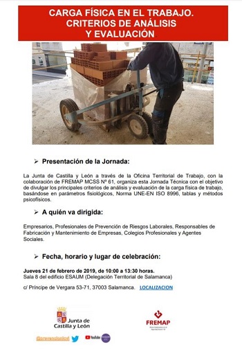 La Jornada se celebrará el próximo 21 de febrero de 2019 en la Sala 8 del edificio ESAUM (Delegación Territorial de la Junta de Castilla y León de Salamanca). c/ Principe de Vergara, 53-71 de Salamanca y está dirigida a Empresarios, Profesionales de Prevención de Riesgos Laborales, Responsables de fabricación y mantenimiento de Empresas, Colegios Profesionales y Agentes Sociales
