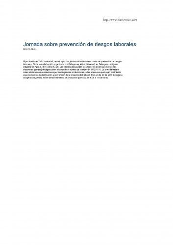 El proximo lunes, dia 26 de abril, tendra lugar una jornada sobre el nuevo bonus de prevencion de riesgos laborales. Dicha jornada ha sido organizada por Debegesay Mutua Universal, en Debegesa, poligono industrial de Azitain, de 15.00 a 17.00. Los interesados pueden inscribirse en la direccion de correo electronico pymes@debegesa.com o llamando al numero de telefono 943 82 01 10. La jornada tratara sobre el sistema de cotizaciones por contingencias crofesionales, a las empresas que hayan contribuido especialmente a la disminucion y prevencion de la siniestralidad laboral. Para el dia 30 de abril, Debegesa acogera una jornada sobre almacenamiento de productos quimicos, de 9.00 a 11.00 horas.