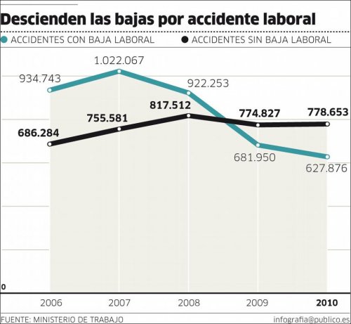 A pesar de la reducción general de accidentes, hay un matiz significativo que los sindicatos relacionan con la crisis: mientras los accidentes que causan baja son cada vez menores (627.876, un 7,9% menos que en 2009), aumentan los que no generan baja (778.653, un 0,5% más que el año anterior). "El miedo a la pérdida del empleo, a la presión de las empresas, que reciben bonificaciones si reducen su siniestralidad, hace que suban los accidentes laborales sin baja", diagnostica el coordinador de la secretaría de Salud Laboral de UGT, Emilio González. En 2007, la brecha entre unos accidentes y otros comenzó a estrecharse hasta que en 2009 los que se declaraban sin baja superaron por primera vez a los que conllevan baja.