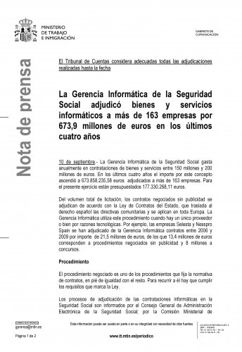 Del volumen total de licitación, los contratos negociados sin publicidad se adjudican de acuerdo con la Ley de Contratos del Estado, que traslada al derecho español las directivas comunitarias y se aplican en toda Europa. La Gerencia Informática utiliza este procedimiento cuando hay un único proveedor o bien por razones tecnológicas. Por ejemplo, las empresas Selesta y Nesspro Spain se han adjudicado de la Gerencia Informática contratos entre 2006 y 2009 por importe de 21,5 millones de euros, de los que 13,4 millones de euros corresponden a procedimientos negociados sin publicidad y 8 millones a concursos.