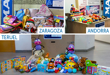 MAZ ha participado a traves de once de sus centros. Asi, el Hospital de Zaragoza, Sede Social; Huesca, Huesca Rehabilitacion, Barbastro, Fraga, Monzon; Teruel, Andorra, Alcaniz y Calamocha se han sumado a esta cita que ha hecho posible el reparto de juguetes y regalos entre ninos y ancianos de toda la Comunidad.
