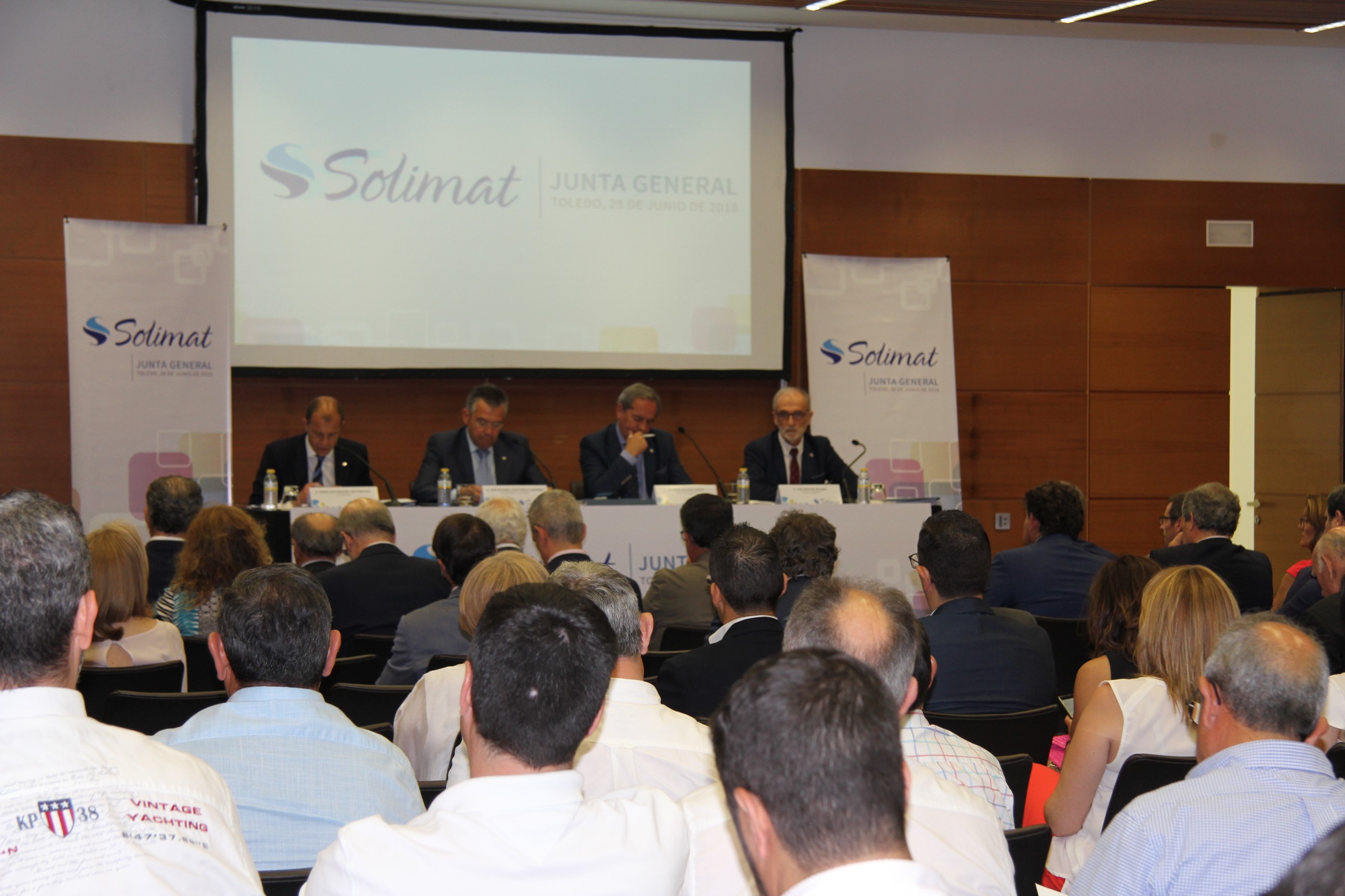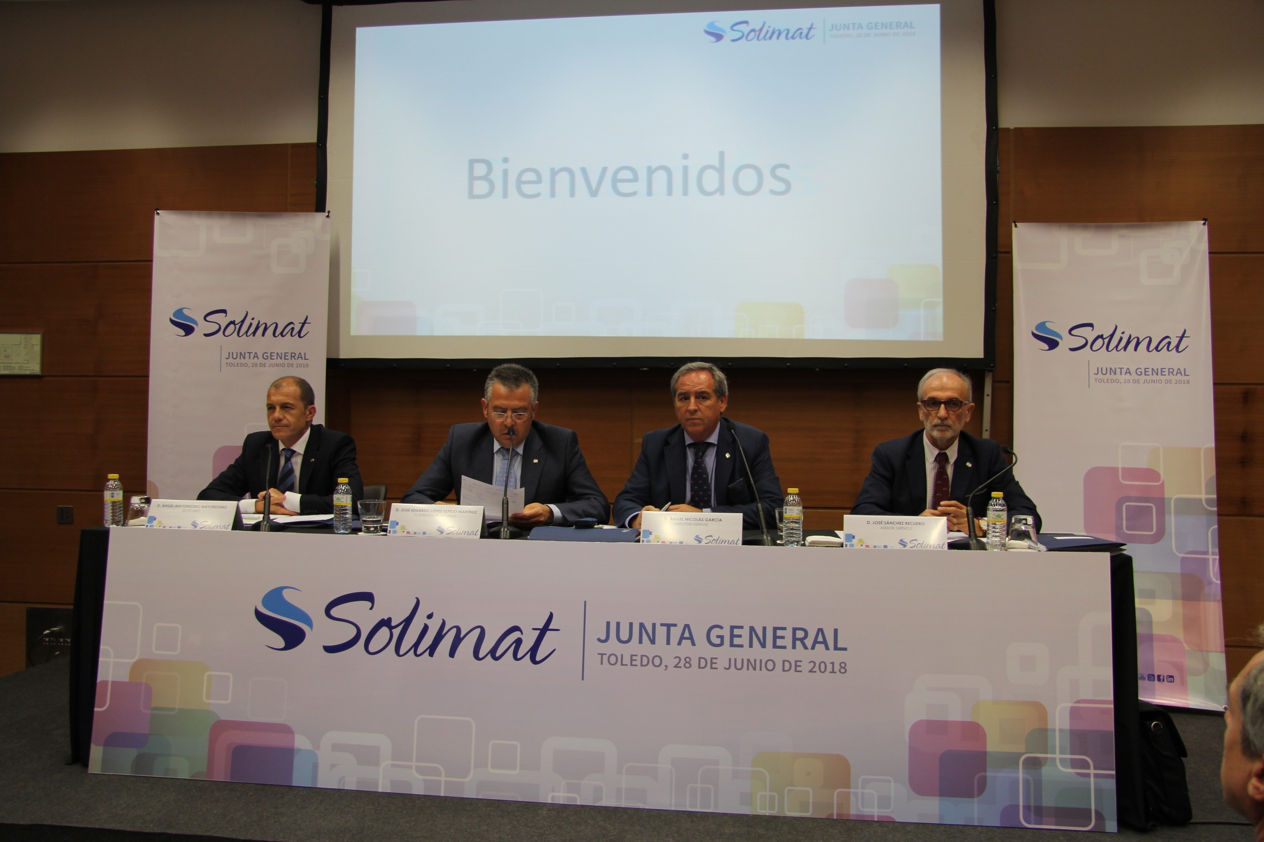 El Palacio de Congresos «El Greco» ha acogido la celebracion de la Junta General Ordinaria de Solimat. Presidida por Jose Eduardo Lopez-Espejo, Vicepresidente II de la Mutua, quien ha estado acompanado de Angel Mayordomo, Secretario, Angel Nicolas, Director Gerente de la entidad y Jose Sanchez Recuero, Asesor Juridico de la mutua.