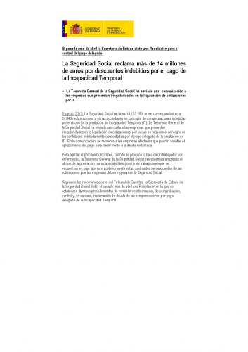 La Seguridad Social reclama 14.123.169 euros correspondientes a 24.640 reclamaciones a varias sociedades en concepto de compensaciones indebidas por el abono de la prestación de Incapacidad Temporal (IT). La Tesorería General de la Seguridad Social ha enviado una carta a las empresas que presentan irregularidades en la liquidación de cotizaciones, por la que se requiere el reintegro de las cantidades indebidamente descontadas por el pago delegado de la prestación de IT. En la comunicación, se recuerda a las empresas afectadas que podrán solicitar el aplazamiento del pago para hacer frente a la deuda reclamada.