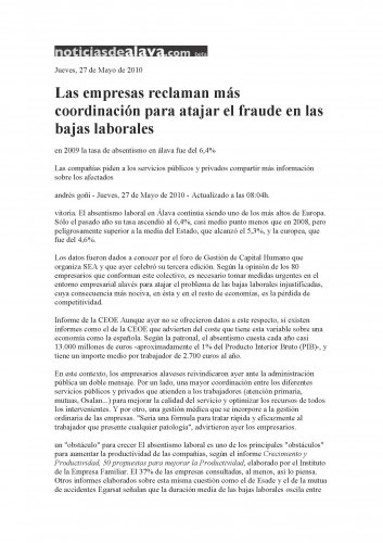 Los datos fueron dados a conocer por el foro de Gestión de Capital Humano que organiza SEA y que ayer celebró su tercera edición. Según la opinión de los 80 empresarios que conforman este colectivo, es necesario tomar medidas urgentes en el entorno empresarial alavés para atajar el problema de las bajas laborales injustificadas, cuya consecuencia más nociva, en ésta y en el resto de economías, es la pérdida de competitividad.