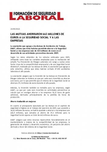 En cuanto al presupuesto ejecutado por las Mutuas en el capitulo de seguridad e higiene en el trabajo del ejercicio de 2009, que ascendio a 36,62 millones de euros, se habria ayudado a ahorrar a las empresas uno 626,5 millones, que sumados al ahorro de 37,3 millones para la Seguridad Social supone un total de 663 millones de euros.
