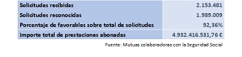 El importe total de estas prestaciones, que las Mutuas abonaron puntualmente en todos y cada uno de los plazos (hasta diez, en el caso de alguna de las prestaciones), alcanzó a fecha de 31 de diciembre los 4.932.416.531 euros.