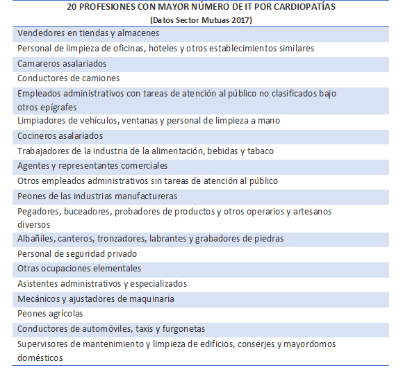 En cuanto a la profesión desempeñada, el mayor número de cardiopatías, tal y como puede verse en la siguiente tabla, se dan entre vendedores que trabajan cara al público, personal de limpieza y camareros. Destacan también los conductores de camiones y, de nuevo, otro oficio de atención al público, en este caso el de empleados administrativos.