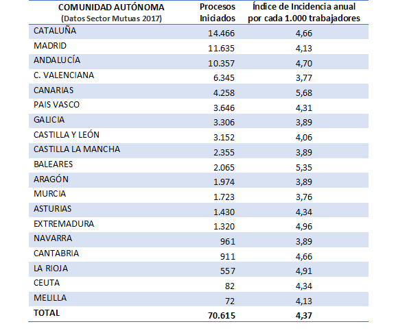 Regionalizando los datos, se puede observar que Cataluña, Madrid y Andalucía son las regiones en las que se produce el mayor número de bajas por patologías cardiovasculares, aunque si atendemos al Índice de Incidencia, las comunidades que lideran esta tabla serían Canarias, Baleares y Extremadura. En el lado opuesto, Murcia, Comunidad Valenciana y Castilla-La Mancha serían las regiones que presentan un menor porcentaje de procesos de Incapacidad Temporal por patologías cardiovasculares entre sus trabajadores.