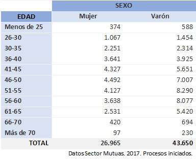 Por tramos de edad y sexo, el mayor número de IT por cardiopatías se dan, en el caso de los hombres, entre los 46 y los 60 años, mientras que en las mujeres el pico de procesos se produce antes, entre los 41 y los 55.