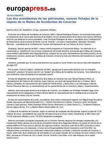 El director de la Mutua de Accidentes de Canarias (MAC), Manuel Rodríguez Rosario, ha anunciado este jueves la composición de la nueva junta directiva de la entidad, con los nombramientos de al menos seis nuevos miembros, entre los que destacan el nuevo presidente, José Fernando Rodríguez de Azero –presidente de la Confederación de Empresarios de la provincia de Santa Cruz de Tenerife– y el nuevo vicepresidente, Sebastián Grisaleña Sánchez, –presidente de la Confederación Canaria de Empresarios de Las Palmas de Gran Canaria–.