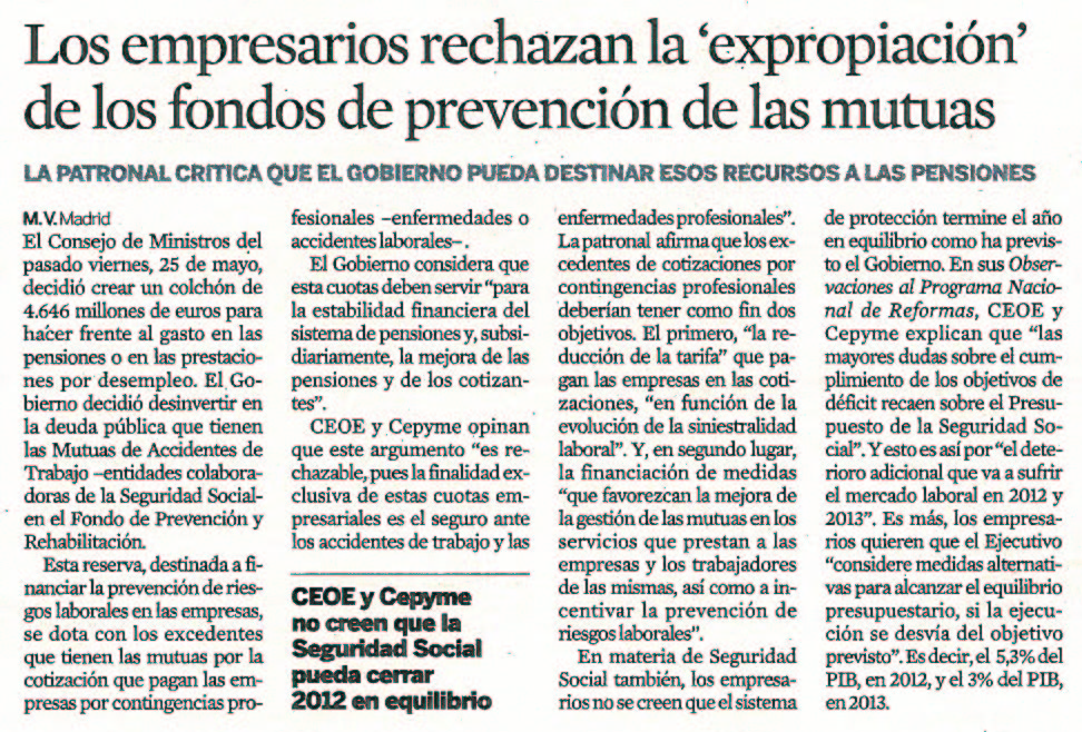 Los empresarios rechazan la -expropiacion- de los fondos de prevencion de las mutuas.